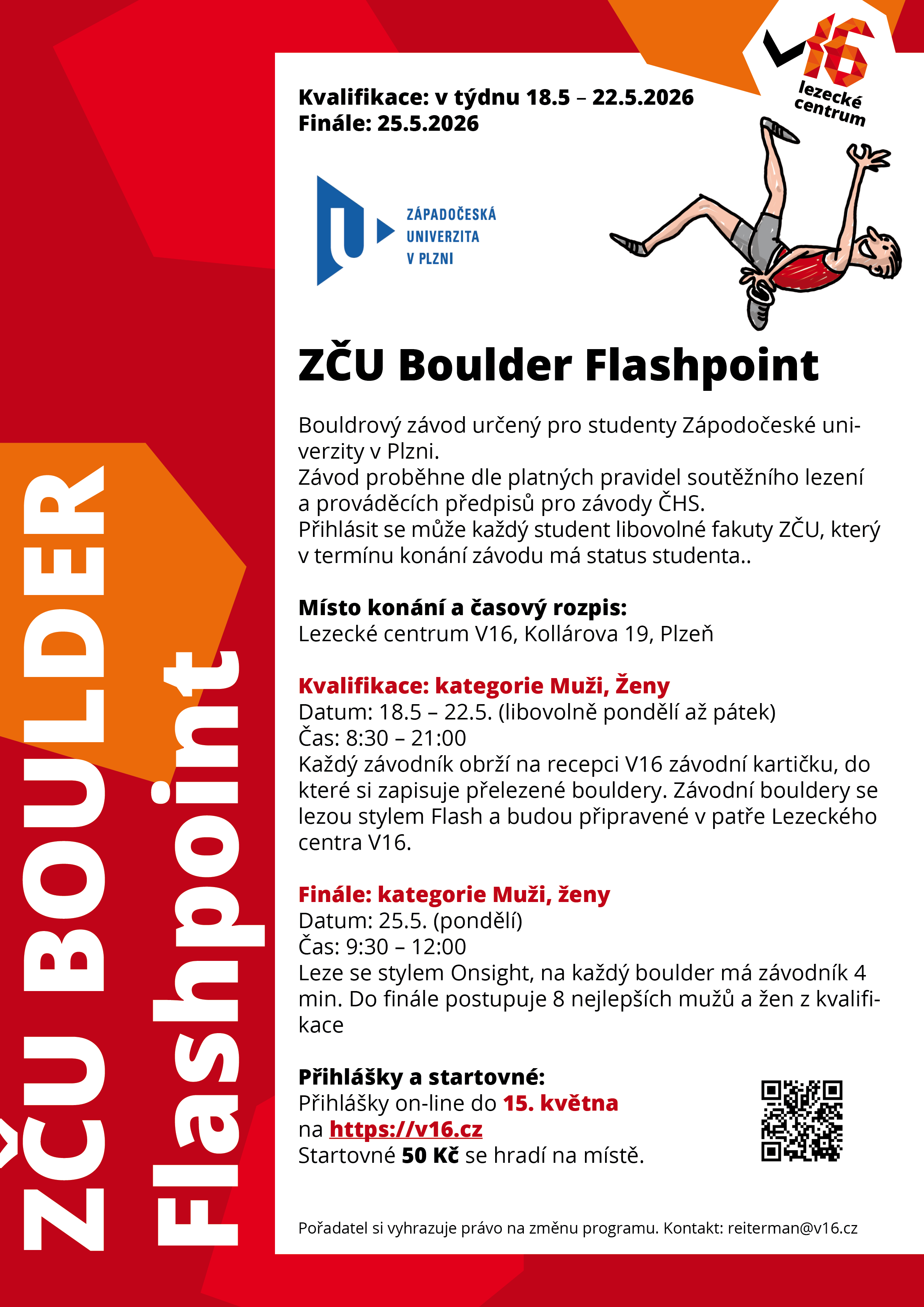 Bouldrový závod určený pro studenty Zápodočeské univerzity v Plzni. Závod proběhne dle platných pravidel soutěžního lezení a prováděcích předpisů pro závody ČHS. Přihlásit se může každý student libovolné fakuty ZČU, který v termínu konání závodu má status studenta.. Místo konání a časový rozpis: Lezecké centrum V16, Kollárova 19, Plzeň